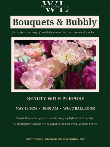Together, we’ll create fresh floral arrangements while enjoying light bites and bubbly—knowing that every arrangement made will be donated to the Fort Bend Women’s Center, bringing a touch of beauty and care to women in transition.